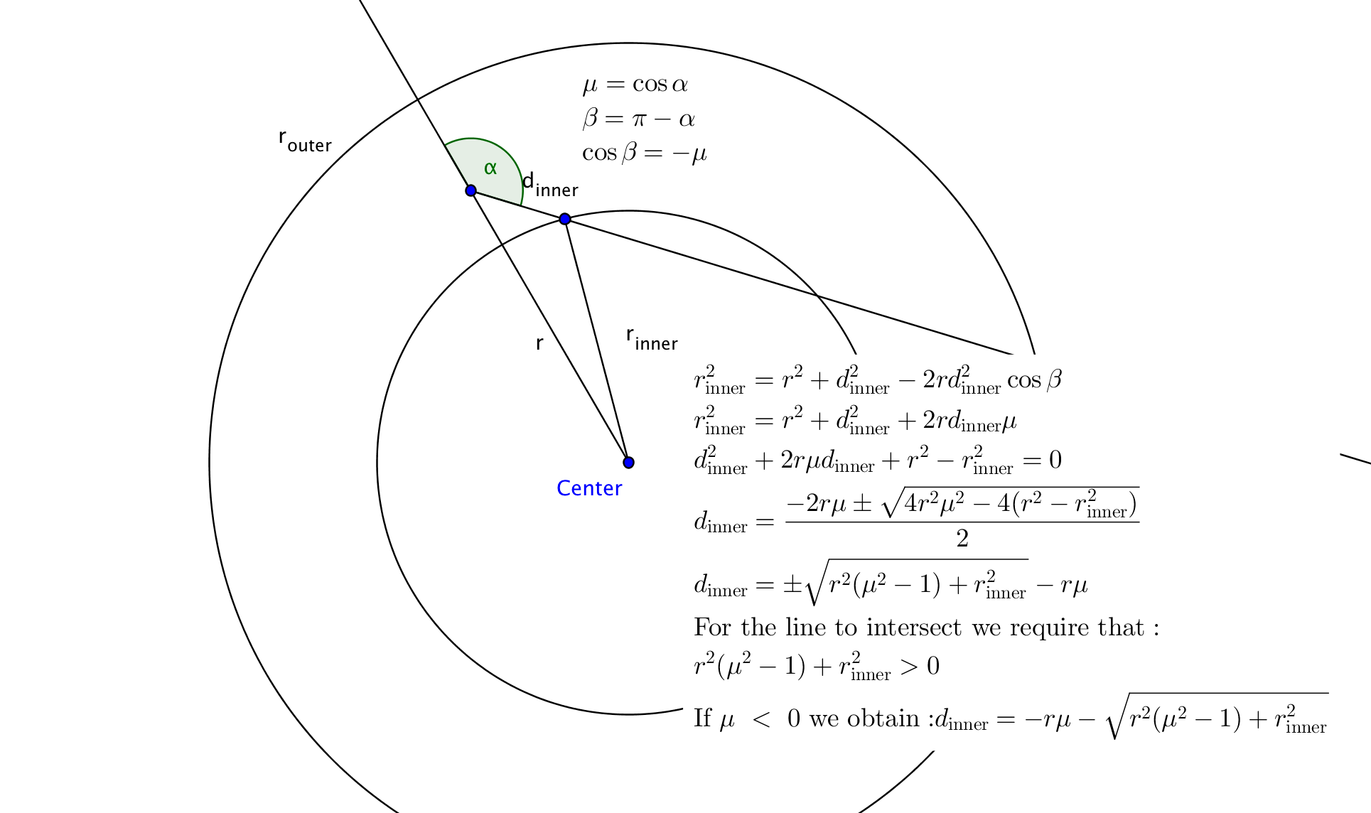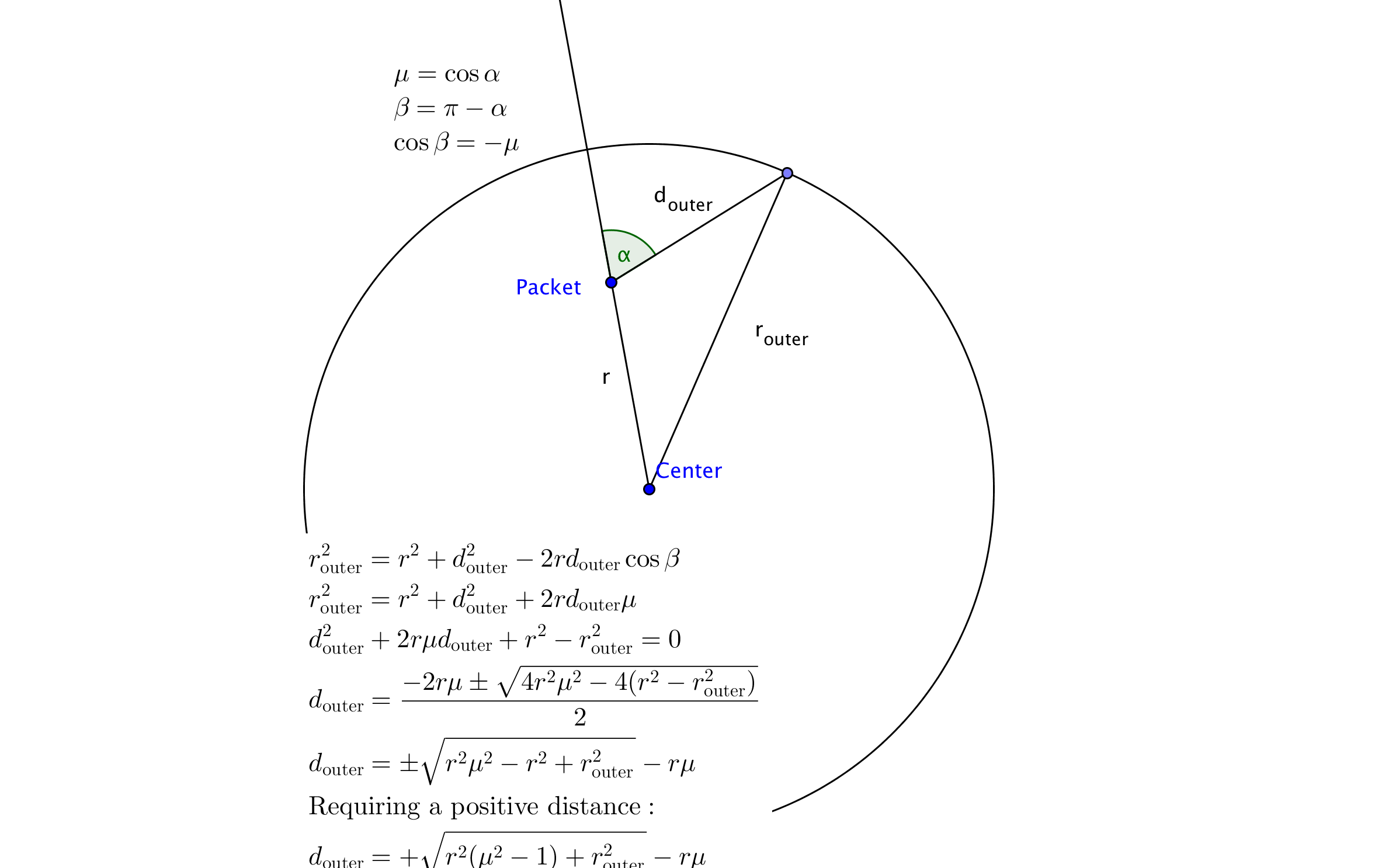 As previously mentioned, the physical properties of the plasma are stored in a discrete mesh of cells for which the plasma state is spatially constant. As a consequence, whenever a packet propagates into a new cell, important quantities which are relevant for performing radiation-matter interactions have to be re-evaluated in accordance with the new state of the ambient material. Thus, during the packet propagation, the distance to the next radial shell is tracked to predict when the packet crosses into a new shell. The following figures summarize the calculations of these distances: