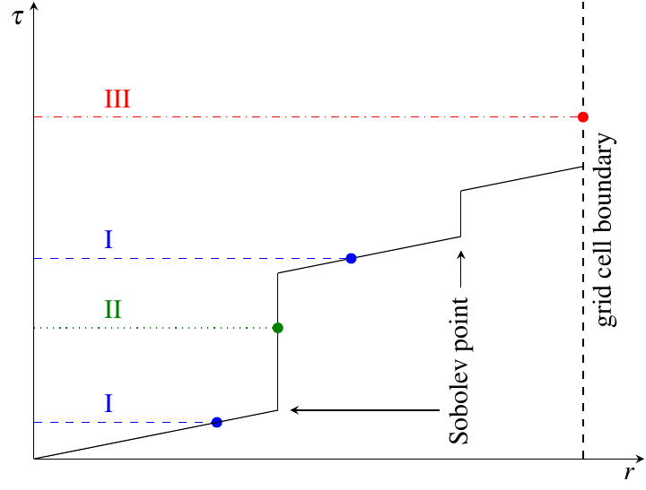 Three possible cases are highlighted in the above diagram, with the dotted lines showing the (randomly assigned) optical depth \(\tau_\mathrm{interaction}\) at which the packet interacts. In case I, the interaction optical depth value is reached on one of the path segments between successive Sobolev points, where the packet is accumulating electron scattering optical depth. Thus, the packet performs a Thomson scattering at the point at which its accumulated optical depth reaches \(\tau_\mathrm{interaction}\). In case II, the interaction optical depth is reached during the instantaneous increment by the line optical depth at one of the Sobolev points. As a consequence, the packet performs an interaction with the corresponding atomic line transition. In both of these cases, the packet is moved to the interaction location, the interaction will be performed (as will be described in the next section), and the process of accumulating optical depth starts over. Finally, if the packet reaches the shell boundary before the optical depth value necessary for a physical interaction is achieved (as in case III), the packet will be moved to the next cell, the plasma properties will be updated, and the accumulation of optical depth will continue in the next cell.