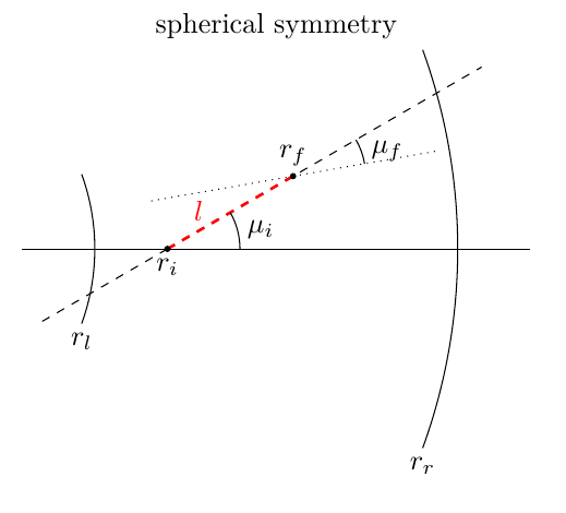 The packet starts the propagation at \(r_i\) along the direction \(\mu_i\). After covering a distance \(l\), the packet is now located at
